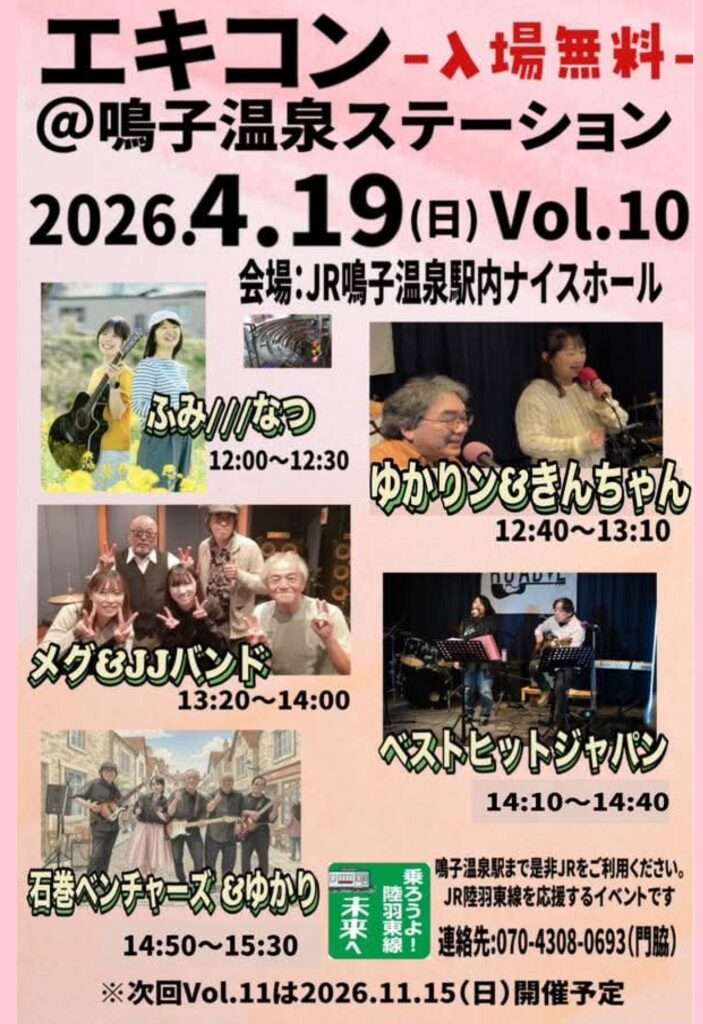エキコン@鳴子温泉ステーション Vol.10 (4/19) 投稿日 2026年4月3日 カテゴリー お知らせ&イベント 恒例となりました 駅舎で 音楽イベント♪ エキコン@鳴子温泉ステーション Vol.10開催日 : 2026年4月19日(日)12:00~15:30会 場 : JR#鳴子温泉駅 ナイスホール(待合室) 入場無料問合せ : 070-4308-0693(門脇) お知らせ 音楽イベント