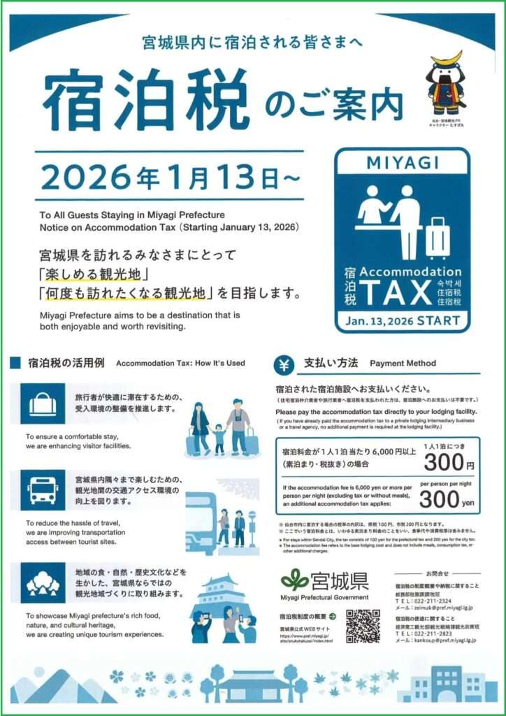 宮城県では2026年1月13日から、お一人様1泊あたりの宿泊料金が素泊まり・税抜きで6,000円以上の場合に、1人1泊あたり300円が課税されます。