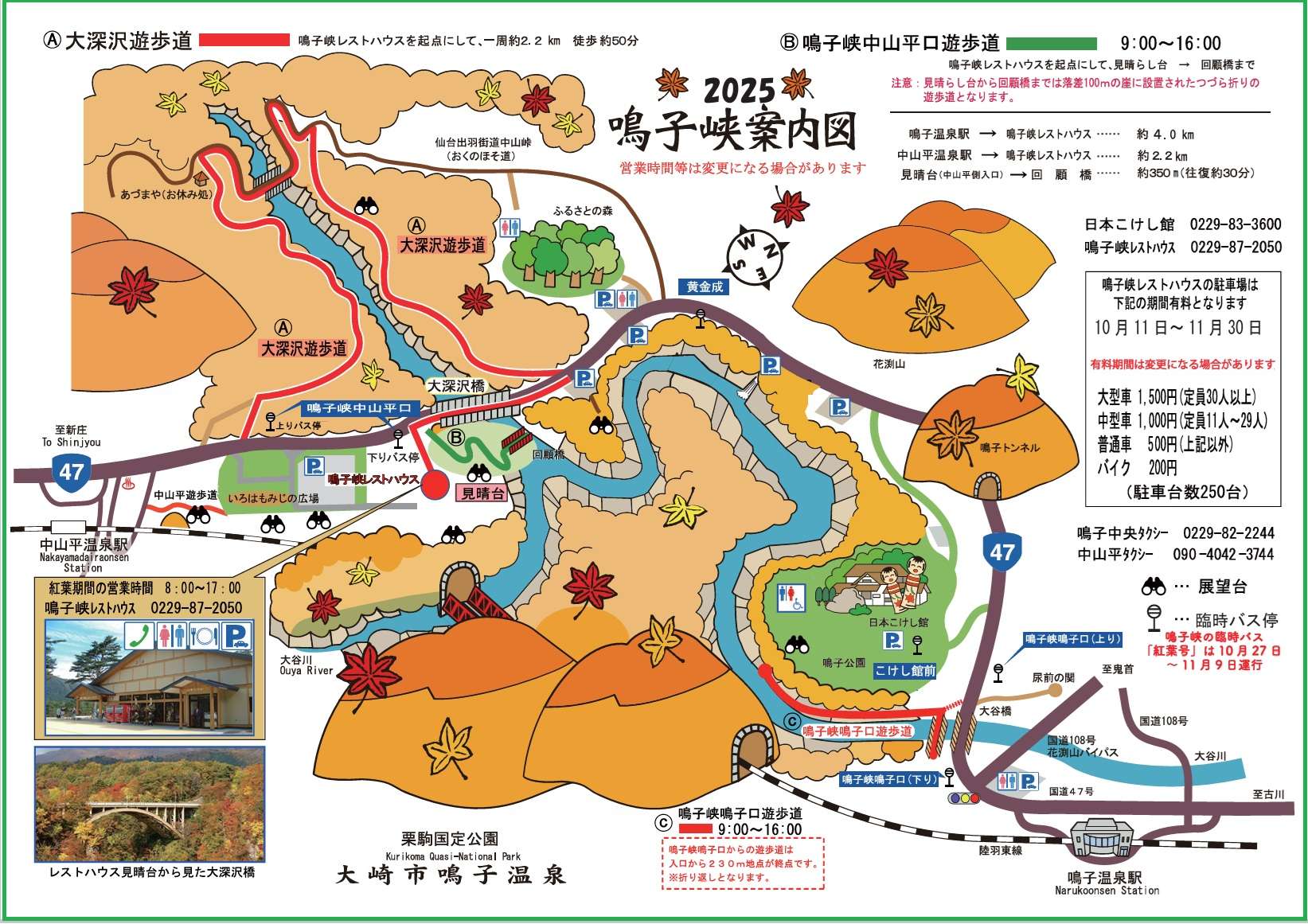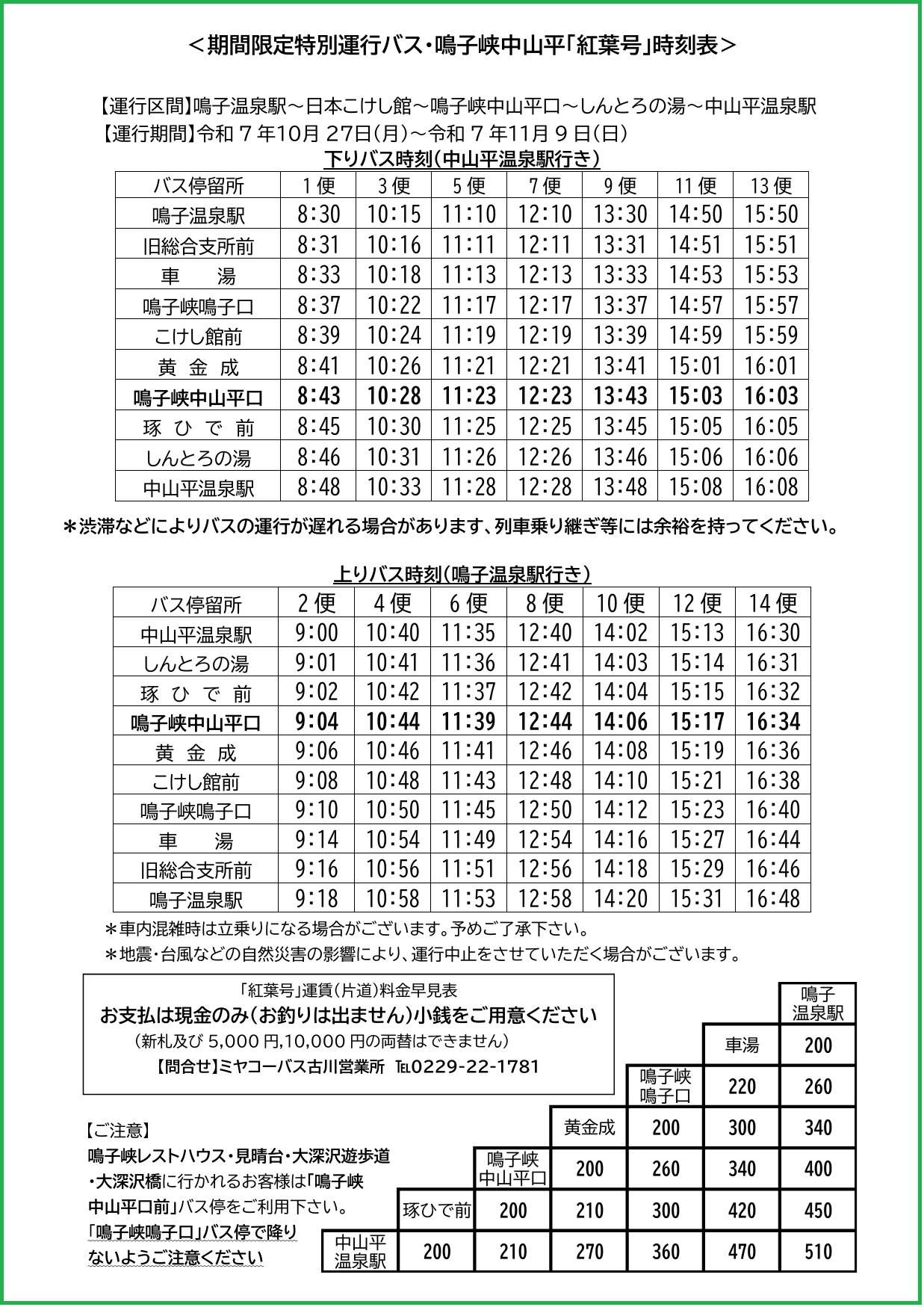 - 紅葉期は道路の渋滞が予想されますのでバスに遅れが出る場合があります。時間には余裕をもって行動をお願いいたします。