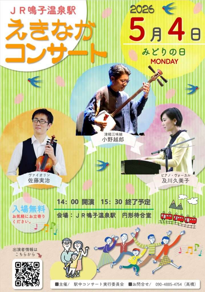 JR鳴子温泉駅 えきなかコンサート (5/4) 投稿日 2026年4月3日 カテゴリー お知らせ&イベント GW恒例 JR鳴子温泉駅 「えきなかコンサート」開催日 : 2026年5月4日(月)14:00~15:30会 場 : JR #鳴子温泉駅 待合室(入場無料)演奏者 : バイオリン・佐藤実治 /津軽三味線・小野越郎/ピアノ&ボーカル・及川久美子問合せ : 090-4885-4754 お知らせ 音楽イベント